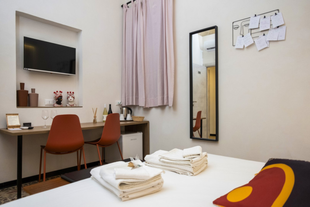 Calda ed accogliente, dove antichi dettagli si fondono con elementi contemporanei. Con affaccio sulla corte interna che dona all’intero ambiente un caldo fascino siculo.