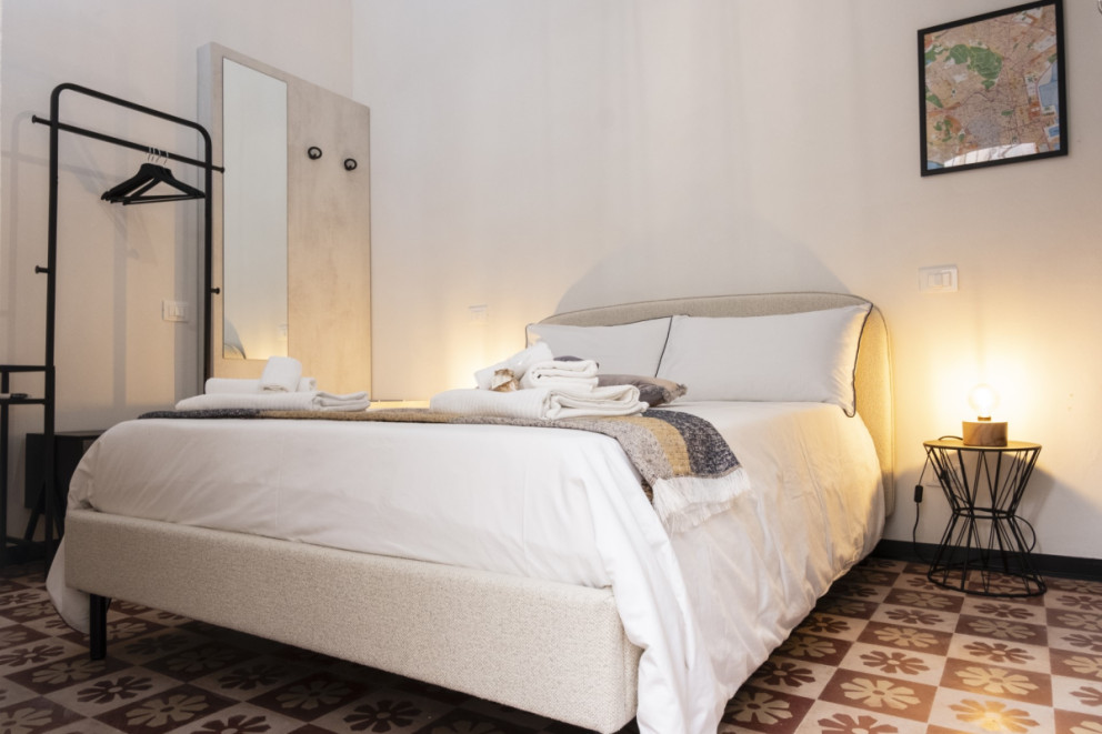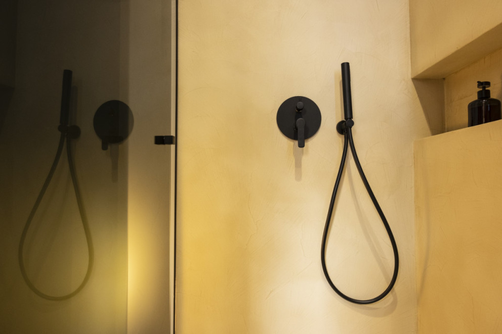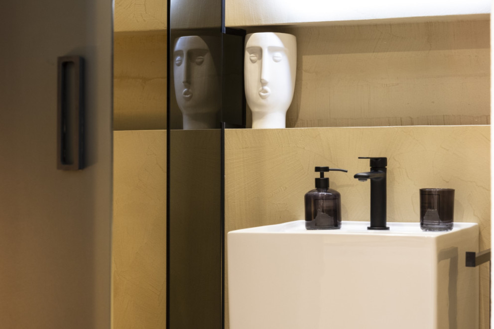 L'ultima arrivata. Intima, accogliente e senza muri divisori. La zona notte è separata dal bagno da pareti di vetro satinato con effetto fumè per creare un ambiete unico e fluido.